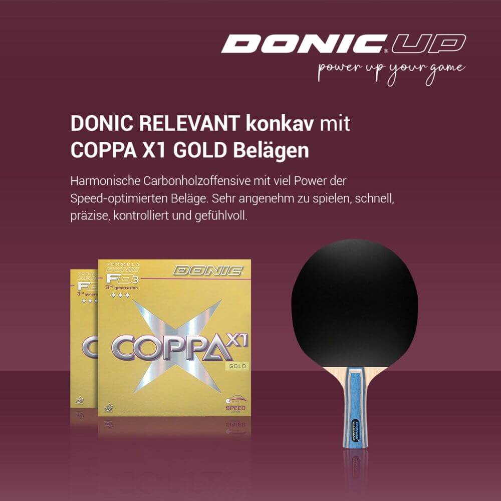The Donic UP Relevant with Coppa X1 Gold is a balanced complete racket that has a harmonious carbon wood construction with the speed-optimized Coppa X1 Gold rubbers This racket impresses with its pleasant playing feel , high speed , precision , control and Feelability . It is ideal for players who want a balanced mix of power and control seek.