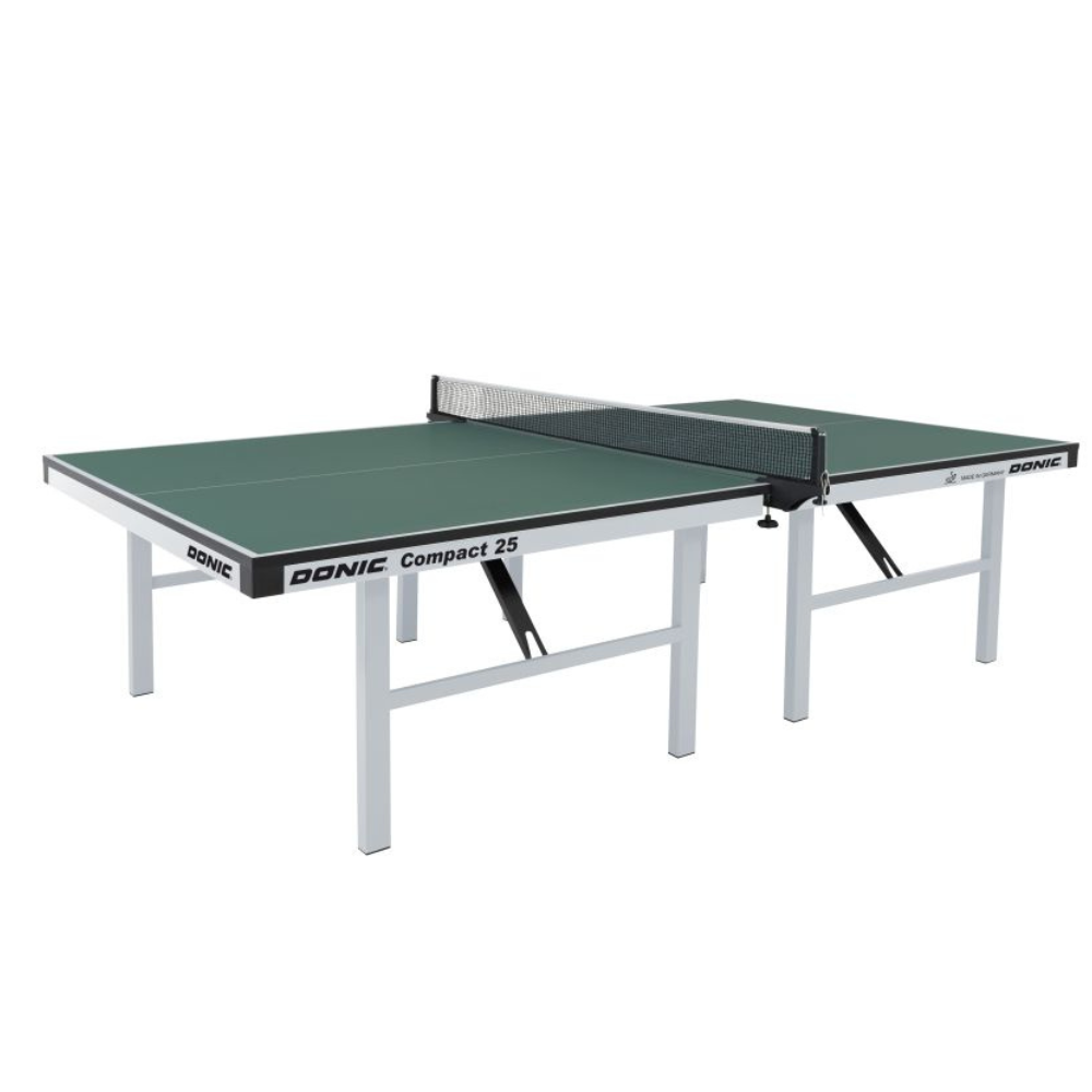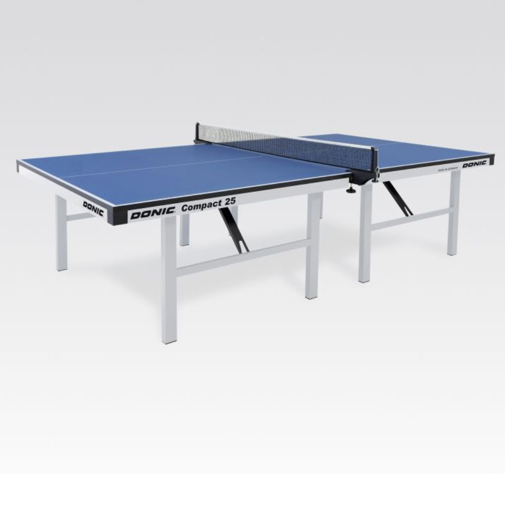 ITTF-zugelassener, konventioneller Standtisch bestehend aus zwei Hälften, welche in Spielposition durch ein Verbindungselement fixiert werden. Der DONIC COMPACT 25 benötigt nur einen minimalen Stauraum von nicht einmal 20 cm Tiefe. Über große Rollen an der Tischinnenseite (Netzseite) sind die einzelnen Hälften leicht zu transportieren.